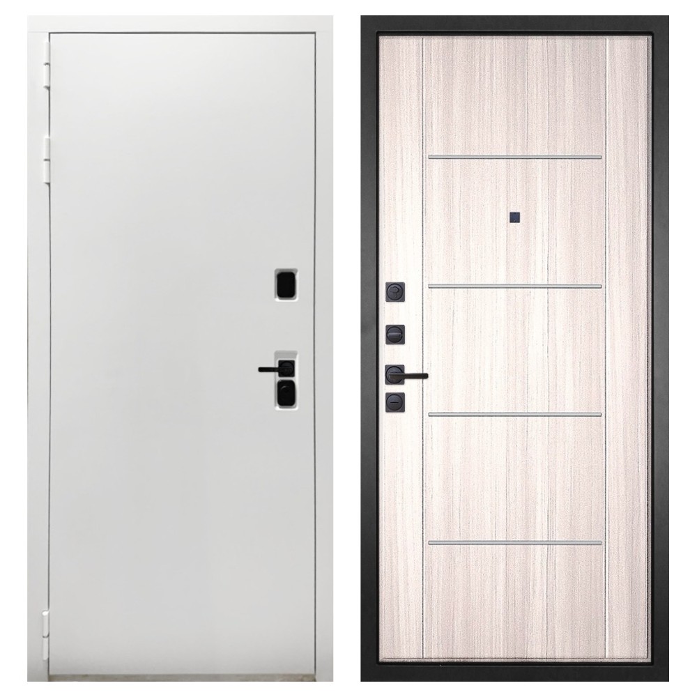 Дизайн и отделка: Белая полимерно-порошковая покраска металлоконструкции устойчива к износу и идеально подходит под интерьер квартиры. Внешняя МДФ-панель и наличники также выполнены в белом цвете, создавая чистый аккуратный вид. Чёрная фурнитура добавляет стильный контраст.
