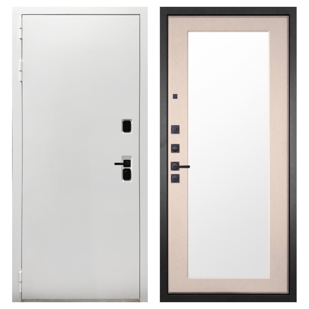 Дизайн и отделка: Белая полимерно-порошковая покраска металлоконструкции устойчива к износу и идеально подходит под интерьер квартиры. Внешняя МДФ-панель и наличники также выполнены в белом цвете, создавая чистый аккуратный вид. Чёрная фурнитура добавляет стильный контраст.