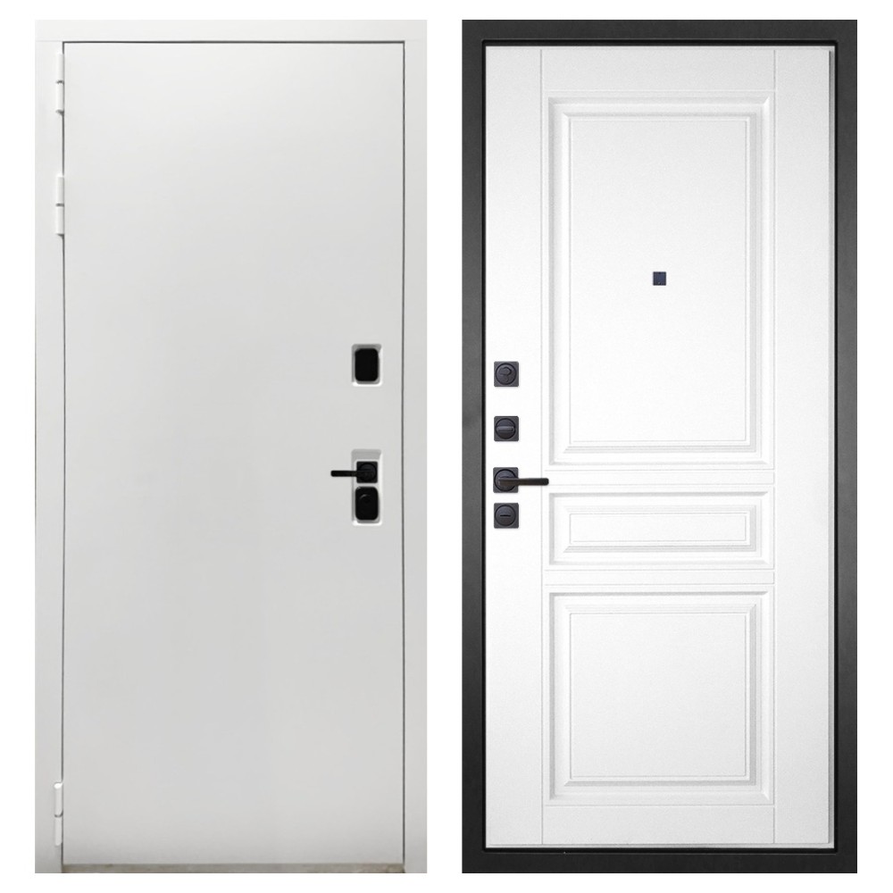 Дизайн и отделка: Белая полимерно-порошковая покраска металлоконструкции устойчива к износу и идеально подходит под интерьер квартиры. Внешняя МДФ-панель и наличники также выполнены в белом цвете, создавая чистый аккуратный вид. Чёрная фурнитура добавляет стильный контраст.