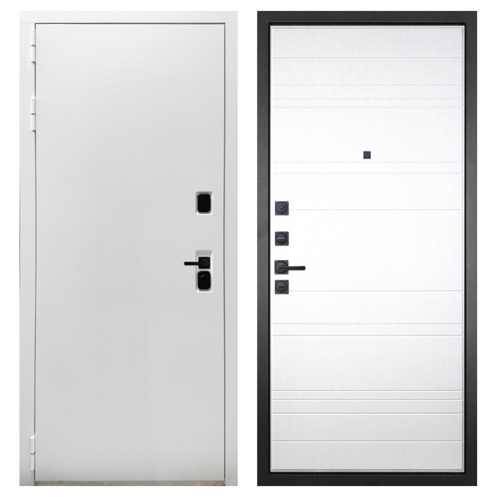 Дизайн и отделка: Белая полимерно-порошковая покраска металлоконструкции устойчива к износу и идеально подходит под интерьер квартиры. Внешняя МДФ-панель и наличники также выполнены в белом цвете, создавая чистый аккуратный вид. Чёрная фурнитура добавляет стильный контраст.