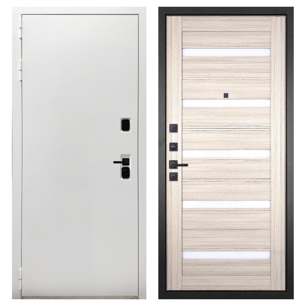 Дизайн и отделка: Белая полимерно-порошковая покраска металлоконструкции устойчива к износу и идеально подходит под интерьер квартиры. Внешняя МДФ-панель и наличники также выполнены в белом цвете, создавая чистый аккуратный вид. Чёрная фурнитура добавляет стильный контраст.