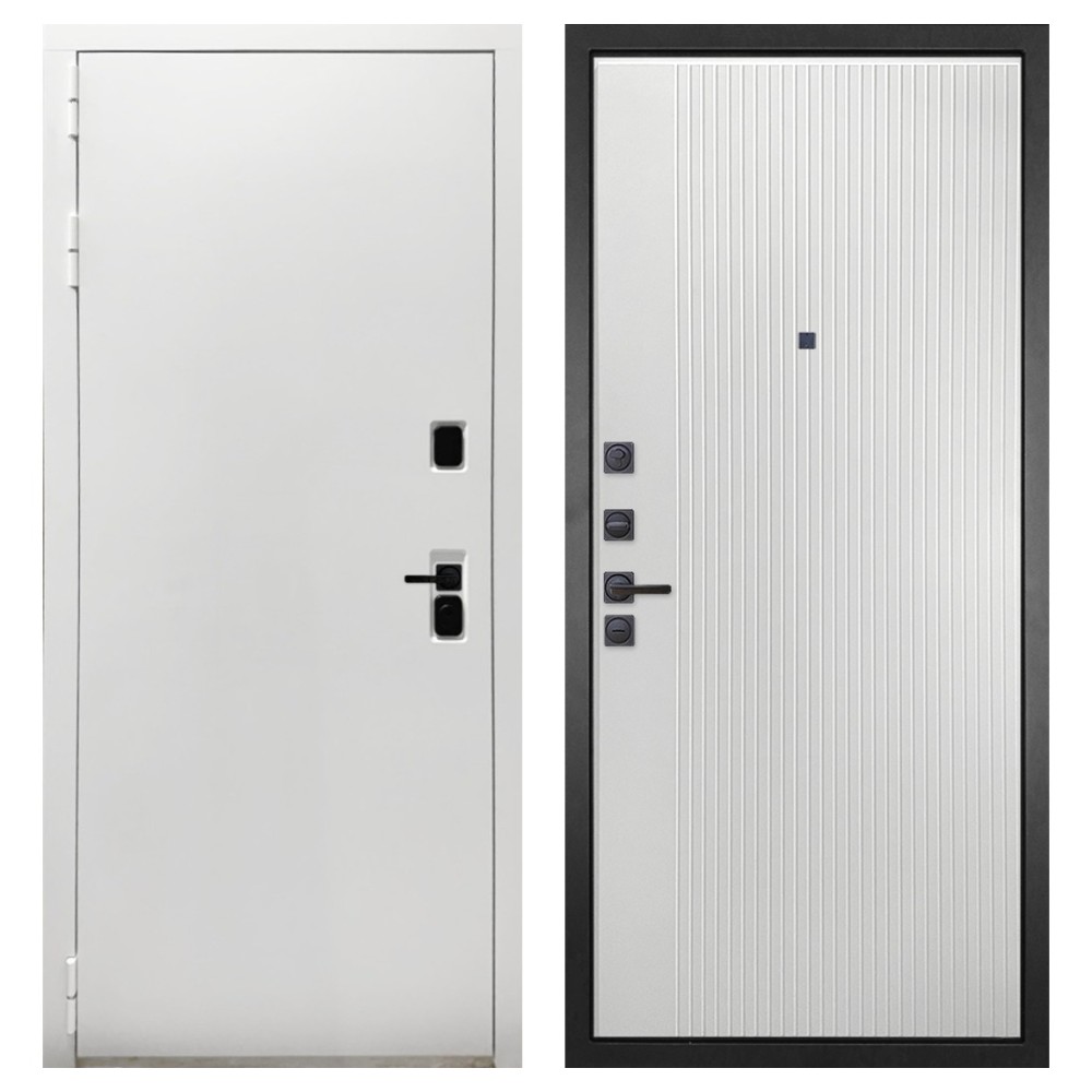 Дизайн и отделка: Белая полимерно-порошковая покраска металлоконструкции устойчива к износу и идеально подходит под интерьер квартиры. Внешняя МДФ-панель и наличники также выполнены в белом цвете, создавая чистый аккуратный вид. Чёрная фурнитура добавляет стильный контраст.