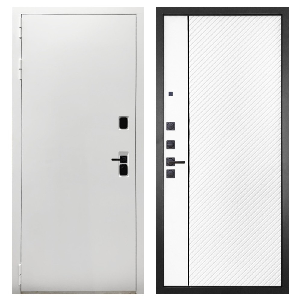 Дизайн и отделка: Белая полимерно-порошковая покраска металлоконструкции устойчива к износу и идеально подходит под интерьер квартиры. Внешняя МДФ-панель и наличники также выполнены в белом цвете, создавая чистый аккуратный вид. Чёрная фурнитура добавляет стильный контраст.