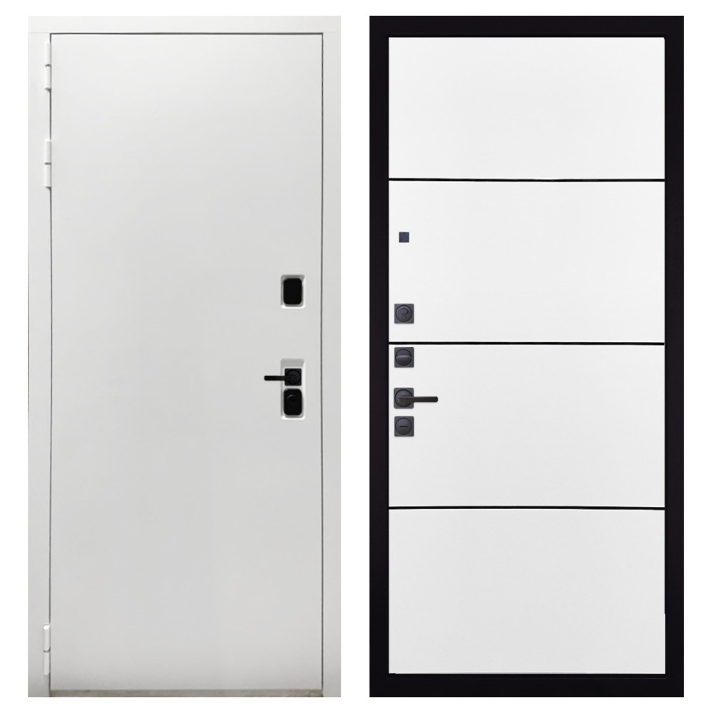 Дизайн и отделка: Белая полимерно-порошковая покраска металлоконструкции устойчива к износу и идеально подходит под интерьер квартиры. Внешняя МДФ-панель и наличники также выполнены в белом цвете, создавая чистый аккуратный вид. Чёрная фурнитура добавляет стильный контраст.