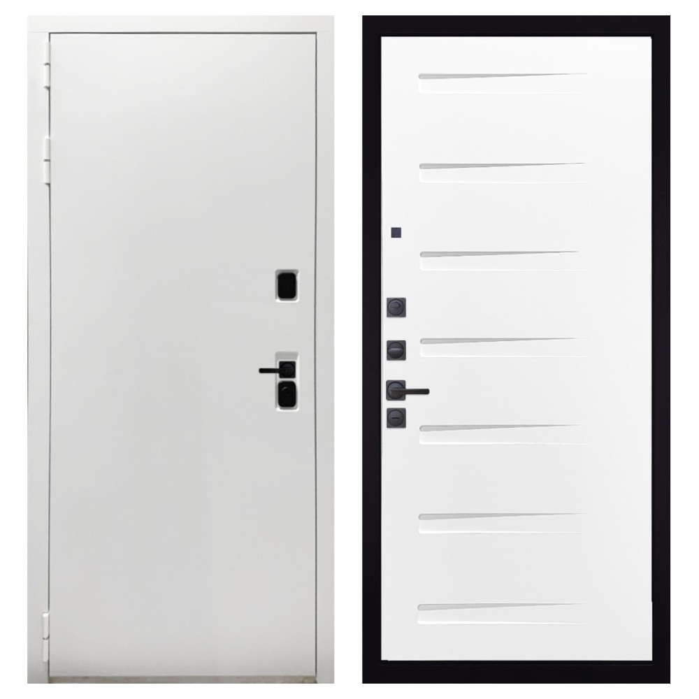 Дизайн и отделка: Белая полимерно-порошковая покраска металлоконструкции устойчива к износу и идеально подходит под интерьер квартиры. Внешняя МДФ-панель и наличники также выполнены в белом цвете, создавая чистый аккуратный вид. Чёрная фурнитура добавляет стильный контраст.