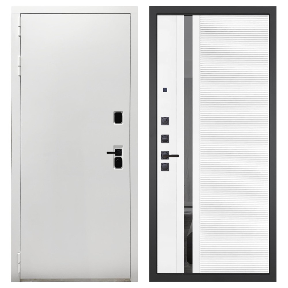Дизайн и отделка: Белая полимерно-порошковая покраска металлоконструкции устойчива к износу и идеально подходит под интерьер квартиры. Внешняя МДФ-панель и наличники также выполнены в белом цвете, создавая чистый аккуратный вид. Чёрная фурнитура добавляет стильный контраст.