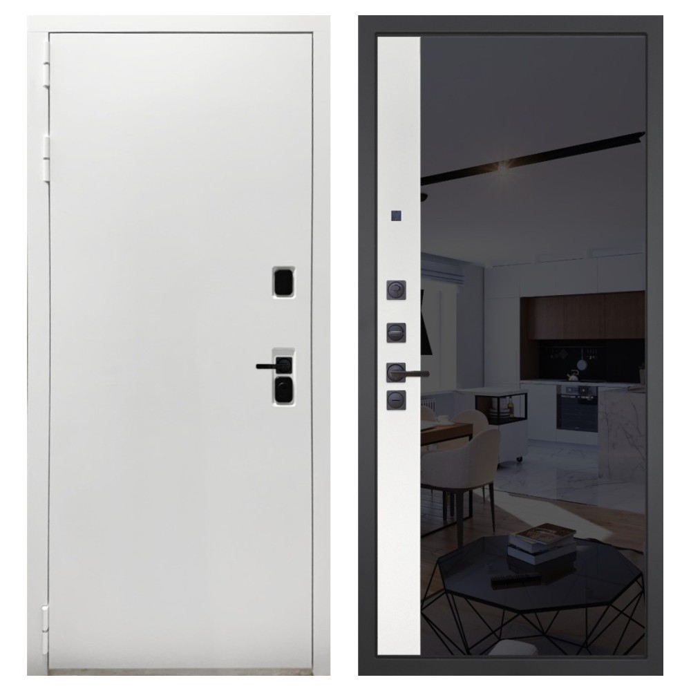 Дизайн и отделка: Белая полимерно-порошковая покраска металлоконструкции устойчива к износу и идеально подходит под интерьер квартиры. Внешняя МДФ-панель и наличники также выполнены в белом цвете, создавая чистый аккуратный вид. Чёрная фурнитура добавляет стильный контраст.
