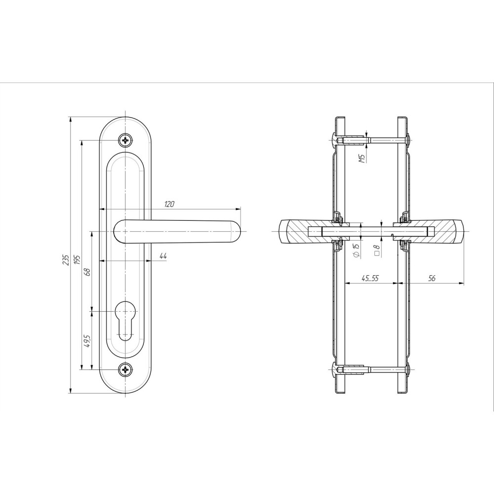 Ручки на планке под цилиндровый механизм. Предназначены для китайских металлических дверей толщиной 45-55 мм. Межосевое расстояние 68 мм.