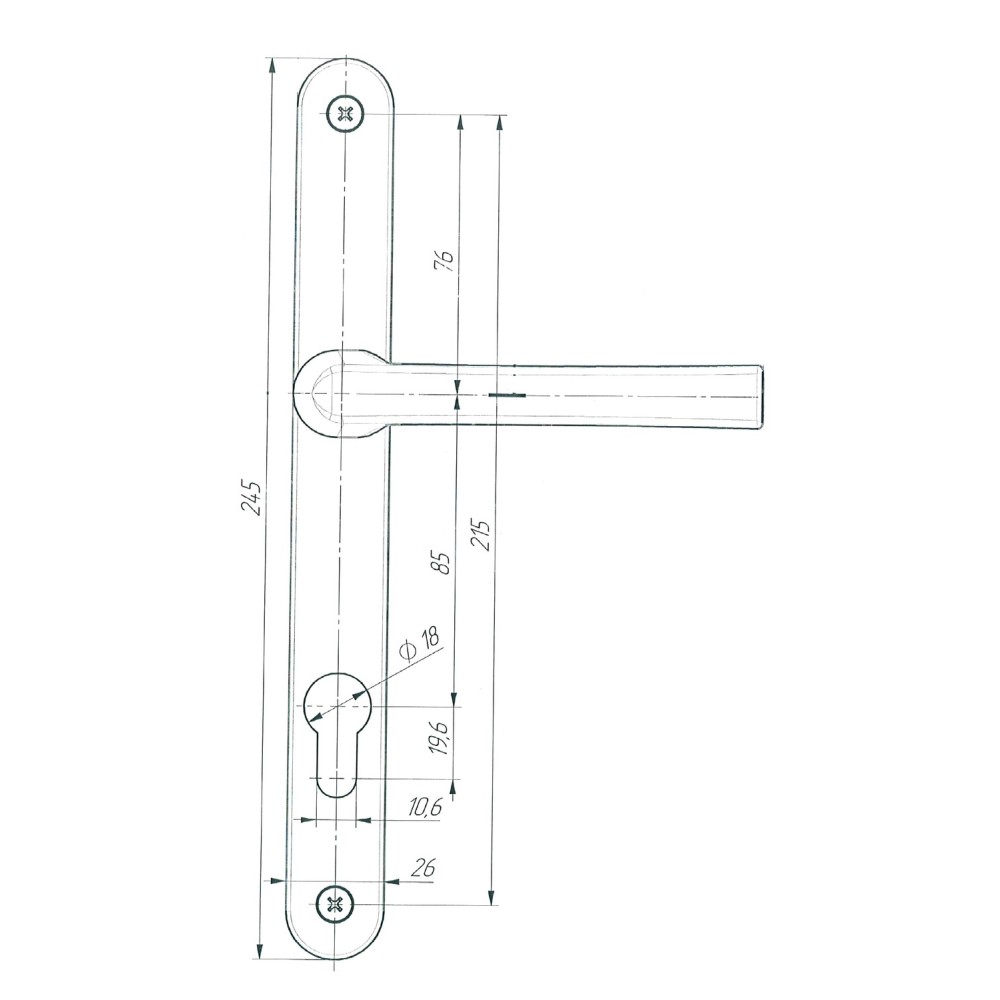 Ручки на планке с подпружиненным механизмом и межосевым расстоянием 85 мм. Предназначены для комплектации узкопрофильных замков с межосевым расстоянием 85 мм. и установки в двери из алюминиевого и пластикового профиля. Ширина планки 26 мм, высота планки 245 мм.