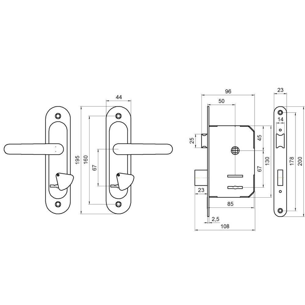 Замок врезной с ручками. Предназначен для установки в деревянные двери толщиной до 45мм, правого и левого открывания. Ригель прямоугольного сечения, вылет 22мм. Универсальная защелка. Стальной корпус, покрыт гальваническим покрытием. Межосевое расстояние 67 мм. Удаление ключевого отверстия 55мм. Материал ручек алюминиевый сплав. Комплектация: замок, 3 ключа, ручки, ответная планка, винтовые стяжки.