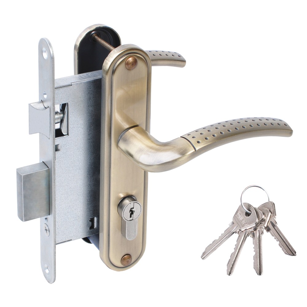 Замок Omega (Омега) врезной цилиндровый с защёлкой в комплекте с ручкой ЗВ4-55.27 (ант.бронза), 4 кл.