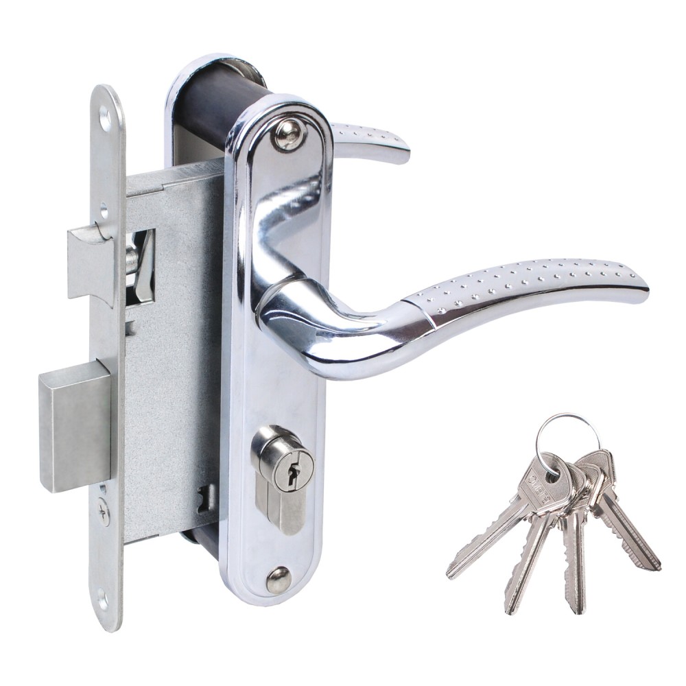 Замок Omega (Омега) врезной цилиндровый с защёлкой в комплекте с ручкой ЗВ4-55.27 (хром), 4 кл.