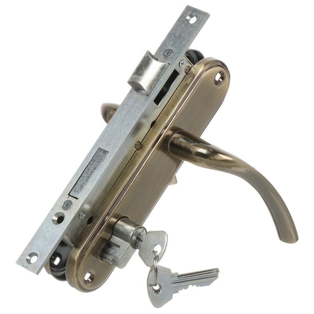 Замок Omega (Омега) врезной цилиндровый с защёлкой в комплекте с ручкой ЗВ4-70.27 (ант.бронза), 4 кл.