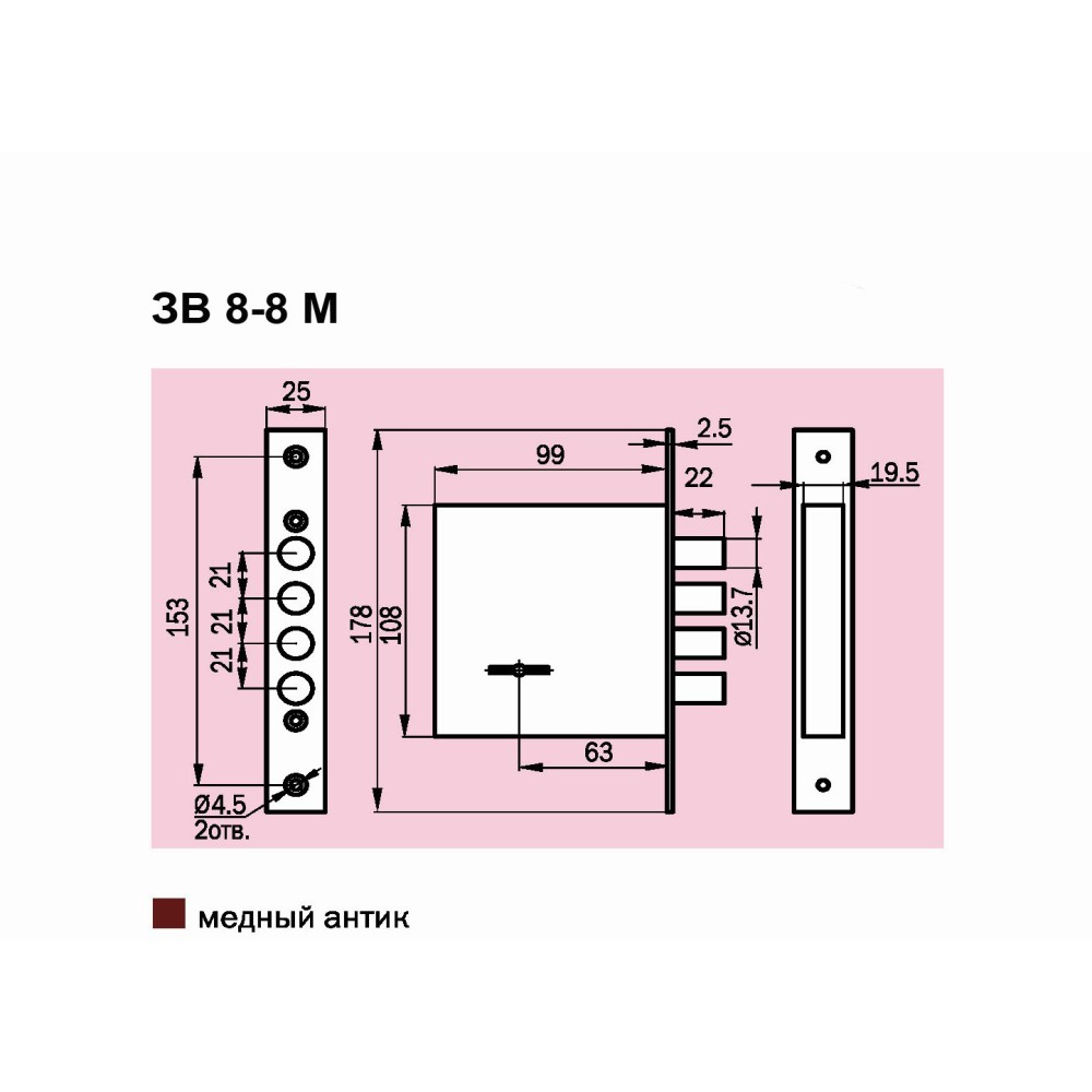 Замок врезной 8-сувальдный ЗВ8-8М/13 предназначен для установки в металлические двери толщиной 40-50 мм, а также в металлические шкафы. Замок универсальный, возможна установка как в правые, так и в левые двери. В комплекте: шестигранные накладки "медный антик", 3 стальных ключа длиной 88 мм, ответная планка. Открывается и закрывается изнутри и снаружи ключом. Замок имеет усиленную конструкцию: засов изготовлен из четырех мощных стержней круглого сечения. Покрытие корпуса — цинковое. Покрытие лицевой и ответной планок — хром. Замок имеет защиту от высверливания, защиту от отмычек. Изготовлен из высокопрочных материалов. Имеет защитное покрытие. Количество секретных комбинаций - 250 000. Четыре ригеля диаметром 13,7 мм с вылетом 22 мм. Бэксет: 66,5 мм.