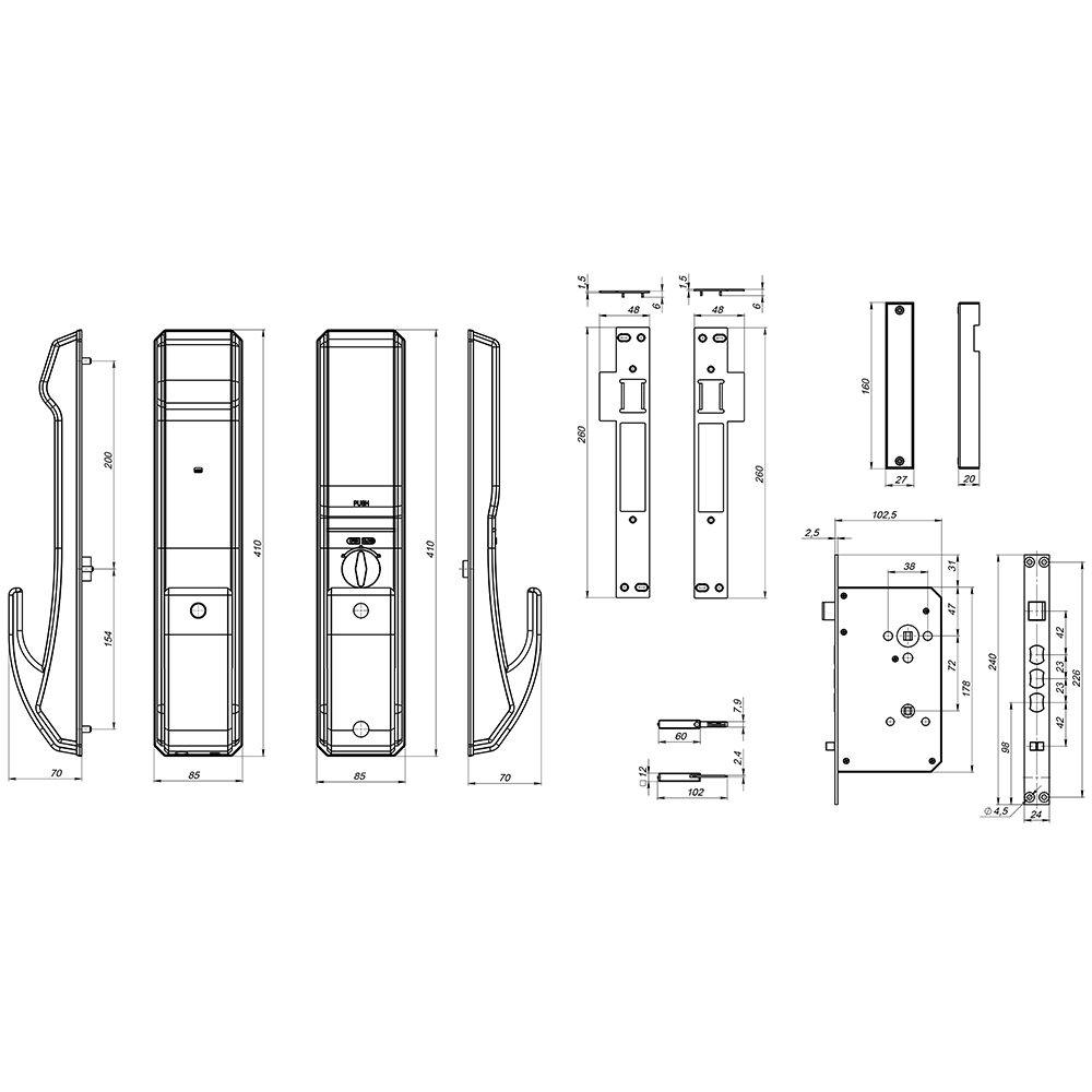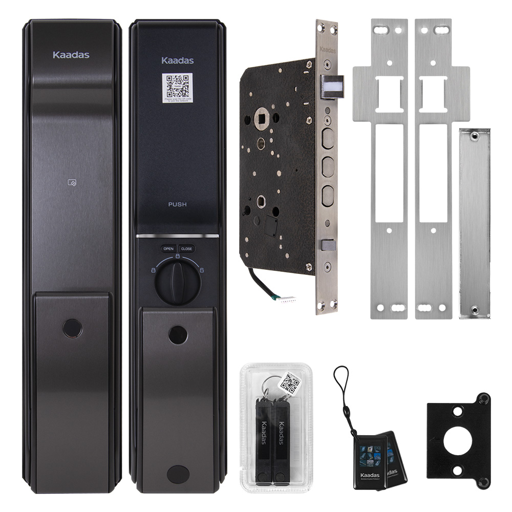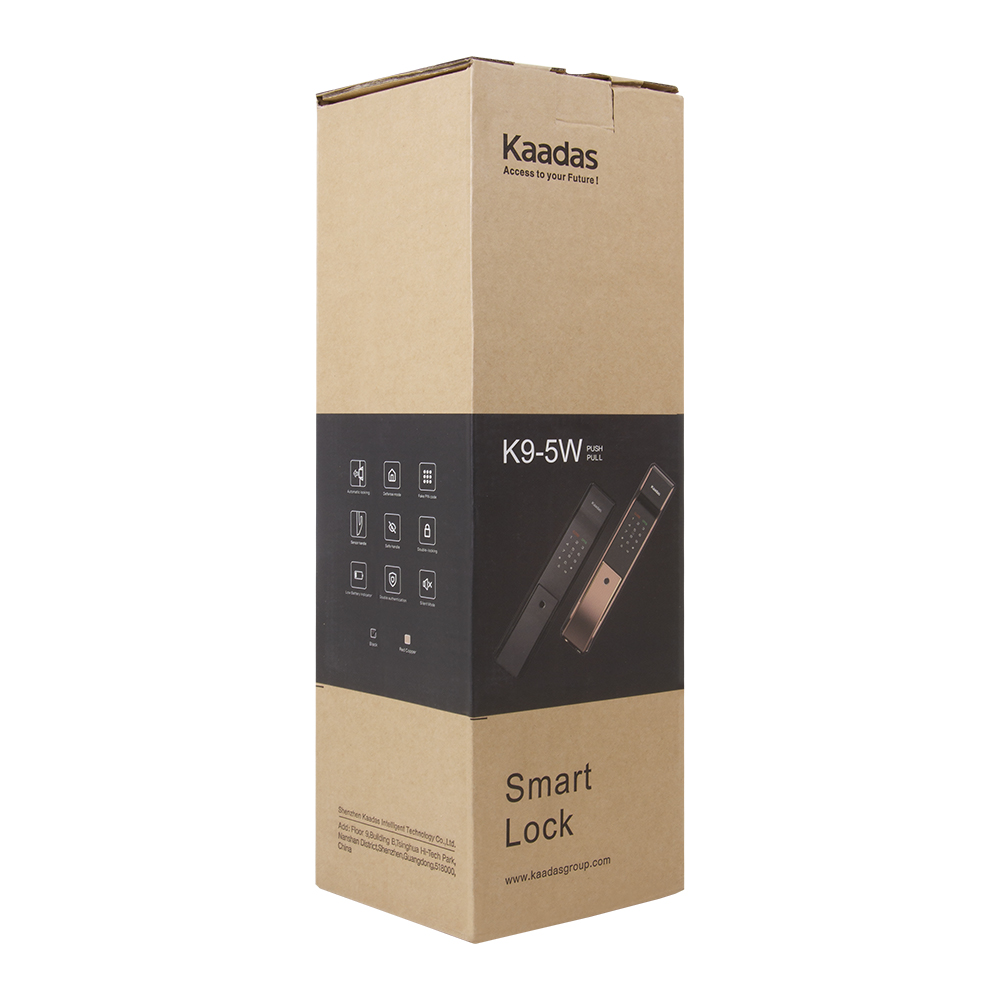 Kaadas K9-5W электронный врезной замок с механизмом "пуш-пул", такая конструкция позволяет открыть дверь одним нажатием на ручку замка. Корпус замка выполнен из металла черного цвета. Врезная часть имеет три ригеля. Замок оснащен встроенным биометрическим сканером отпечатка пальца. Открывается паролем - 10 шт., запоминает до 100  RF-карт и отпечатков пальцев, есть аварийный механический ключ. В замке есть функция голосового сообщения на английском языке. Главное отличие от модели К9-5 это наличие Wi-Fi и возможностью управления замком из любой точки мира. Рекомендуемая толщина двери 28-120 мм.  Габаритные размеры: внешняя часть - 400 x 80 x 30 мм, внутренняя часть -460 x 80 x 32 мм.
